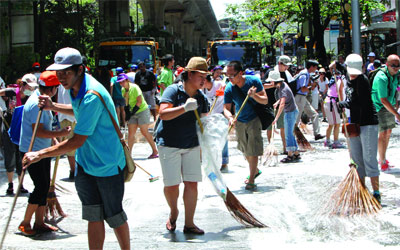 جانب من الحملة الضخمة لتنظيف شوارع بانكوك من مخلفات احتجاجات «القمصان الحمر». إي.بي.إيه