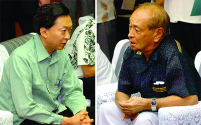 هاتوياما (يسار) في صورة مركبة مع الحاكم المحلي هيروكازو ناكايما. أ.ف.ب