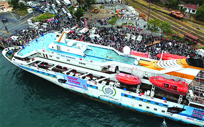 إحدى سفن كسر الحصار التركية قبيل إبحارها نحو شواطئ غزة. أ.ف.ب