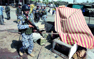 شرطي عراقي يحرس موقع الانفجار في الدورة. أ.ب