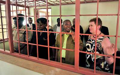 مسؤولون كينيون يتفقدون قفصاً لمحاكمة القراصنة في مومباسي. أ.ف.ب