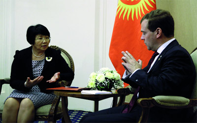 وأبلغت روسيا، التي اعتمدت موقفا حذرا عقب اشتباكات قيرغيزستان، دعمها للسلطات القيرغيزية الجديدة التي تسلمت الحكم بعد الاطاحة بالرئيس كرمان بك باكييف إثر انتفاضة شعبية مطلع ابريل. وتعهد مدفيديف بتوفير الدعم لقيرغيزستان على الرغم من انتقاداته الحادة في ما سبق للاستفتاء على الدستور هناك الشهر الماضي، والذي أجرته ادارة أوتونباييفا التي تهدف الى بناء أول ديمقراطية برلمانية في آسيا الوسطى.