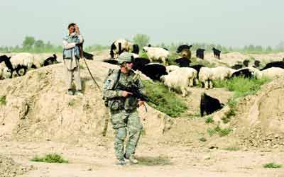 طفل أفغاني يراقب جندياً أميركياً خلال دورية في قندهار. أ.ف.ب