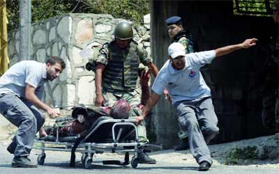 رجال إنقاذ يسعفون جندياً لبنانياً أصيب بالاشتباكات مع قوات الاحتلال في الجنوب. أ.ف.ب