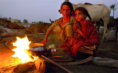 نازحة باكستانية تحاول طهي طعام لها ولطفلتها. غيتي
