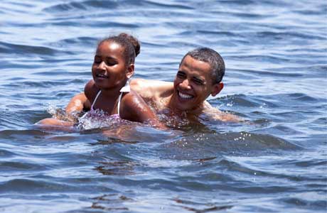 بالصور.. أوباما يسبح مع ابنته في خليج المكسيك المتضرر من كارثة التسرب النفطي