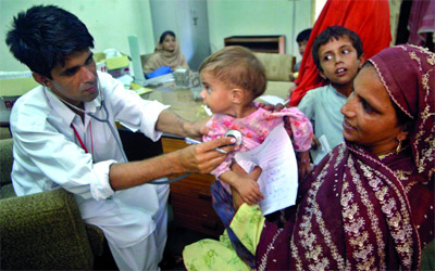 أو لحقت بها أضرار. واجتاحت الفيضانات العارمة الناجمة عن الأمطار الموسمية نحو 20٪ من باكستان وتسببت في نزوح أكثر من 20 مليون شخص. ويستمر الدمار مع تحرك الفيضانات نحو الجنوب، لتغمر عشرات القرى يومياً. وحذر متحدث باسم الأمم المتحدة ان ما يصل الى 3.5 ملايين طفل في باكستان يواجهون خطر الإصابة بأمراض قاتلة تنقلها المياه نتيجة الفيضانات المدمرة التي اجتاحت البلاد. وقال المتحدث باسم مكتب الأمم المتحدة لتنسيق الشؤون الإنسانية موريزيو غاليانو، ان منظمة الصحة العالمية تستعد لمساعدة عشرات الآلاف في حال اصابتهم بالكوليرا. وقال ان المنظمة تستعد لمساعدة ما يصل الى 140 الف شخص في حال انتشار الكوليرا، الا ان الحكومة لم تبلغنا بأية حالة كوليرا مؤكدة. وقال ان نحو 3.5 ملايين طفل معرضون لخطر شديد للإصابة بأمراض قاتلة تنقلها المياه، ومن بينها الأمراض التي تسبب الإسهال مثل مرض الزحار، مقدراً اجمالي عدد الأطفال المعرضين لمثل هذه الأمراض بستة ملايين، وقال ان من بين الأمراض التي يخشى ان يصاب بها الأطفال كذلك التيفوئيد والتهاب الكبد (هاء). وقال ان اكثر ما يهمنا هو الماء والصحة، فالماء النظيف ضروري لمنع انتشار الأمراض القاتلة التي تنقلها المياه. وقد تلوثت المياه بشكل كبير اثناء الفيضانات، وهناك نقص في المياه النظيفة. وذكر مكتب الأمم المتحدة لتنسيق الشؤون الأنسانية انه يخشى من ان تكون باكستان موشكة على موجة ثانية من الوفيات اذا لم تقدم الجهات المانحة مزيداً من الأموال.
