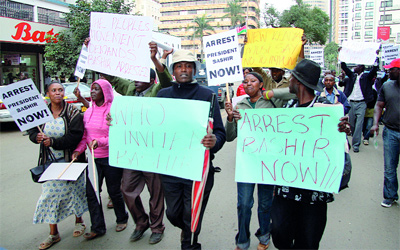 متظاهرون في كينيا طالبوا باعتقال البشير لتنفيذ حكم «الجنائية» بشأن دارفور . أ.ف.ب