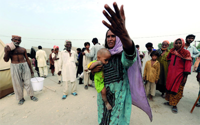 نازحة باكستانية بسبب الفيضانات تطلب معونة غذائية في سكور. أ.ف.ب