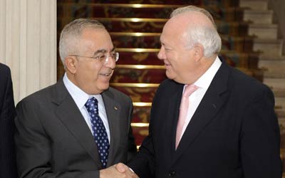 وزير الخارجية الأسباني موراتينوس يستقبل رئيس الوزراء الفلسطيني سلام فياض خلال حضوره الاجتماع الأسباني الفلسطيني الذي عقد قبل أيام. أ ف ب