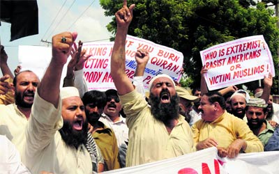باكستانيون غاضبون خلال مســــــــــــــــــــــــــــــــــــــــــيرة فـي مولتان احتجاجاً على خطة حرق المصاحف في أميركا. أ.ب