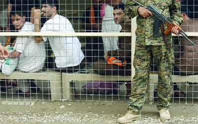 جندي عراقي يقف حارساً أمام السجناء في معتقل الرصافة. أ.ف.ب