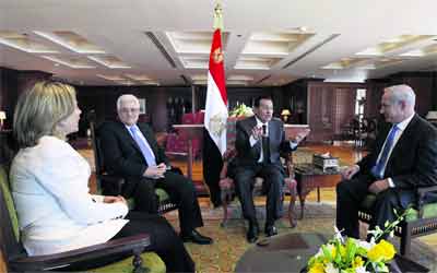 مبارك يتوسط عباس ونتنياهو وكـــــــــــــــــــــــــــــــــلينتون خلال المحادثات. أ.ب