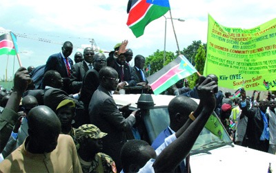 تظاهر آلاف الأشخاص، أمس، في شوارع جوبا عاصمة جنوب السودان، للإعراب عن دعمهم للاستفتاء المتوقع بعد 100 يوم، حول استقلال هذه المنطقة. وقد قطع المتظاهرون الذين كانوا يرقصون ويلوحون بأعلام جنوب السودان، السير في ضواحي المطار لاستقبال رئيس حكومة الجنوب سلفا كير العائد من نيويورك، حيث اطلق حمامتين بيضاوين ترمزان الى السلام،ودعا السكان الى التصويت بكثافة في الاستفتاء. وقال «لا يحصل الاستفتاء سوى مرة واحدة، واذا ما أضعتم هذه الفرصة فإنها ستضيع إلى الأبد»، وأضاف «أريد أن أكون واضحاً: لن نقبل بأي وقف او تأجيل للاستفتاء».