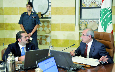 الرئيس سليمان (يمين) يتحدث إلى الحريري خلال جلسة الحكومة في قصر بعبدا. إي.بي.أيه