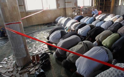 مصلون يؤدون الصلاة في مسجد "الأنبياء" بعد الاعتداء الاسرائيلي. أ ب