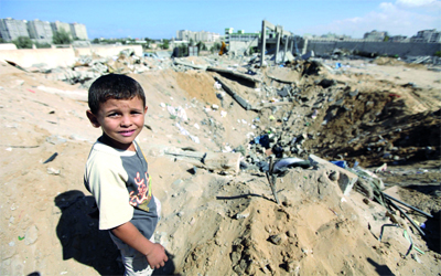 طفل فلسطيني أمام حفرة نتيجة غارات الاحتلال علـــــــــــــــــــــــــــــــــــــــى غزة. رويترز
