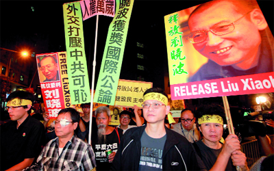 مؤيدون للمعارض الصيني ليو تشياوبو يرفعون صوره ابتهاجاً في هونغ كونغ. إي.بي.إيه