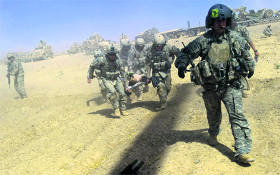 عناصر من فرقة طبية أميركية يسعفون جندياً أصيب بانفجار عبوة ناسفة في إقليم قندهار. أ.ف.ب