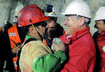 الرئيس التشيلي (يمين) يعانق أحد العمال الناجين. إي.بي.أيه