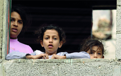 صبيات فلسطينيات يراقبن من نافذة منزلهن في مخيم الشاطئ تشييع الشهيد محمود وشح. رويترز