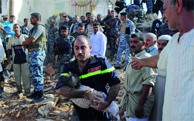 شرطي يحمل جثة طفل قتل بتفجير منزل ضابط الشرطة في تكريت. أ.ب
