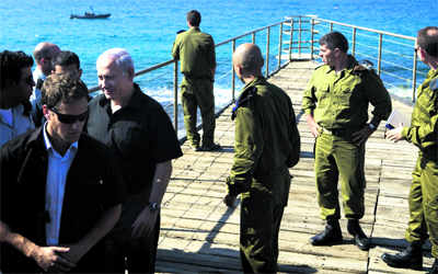نتنياهو خلال زيارته أمس للقوة البحرية التي نفذت الاعتداء الدامي على «أسطول الحرية» لغزة. أ.ب