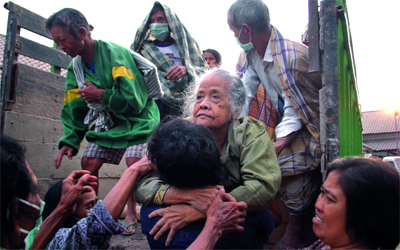 إندونيسي يساعد امرأة مسنة ضمن عملية إخلاء خوفاً من ثوران بركان ميرابي. أ.ب