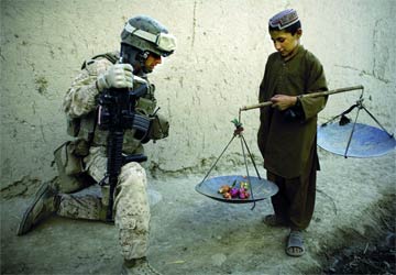 طفل أفغاني يبيع خضراوات لجندي مارينز. أ.ب