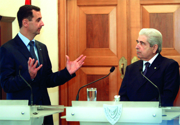 أكد الرئيس السوري بشار الأسد، أن الطريق الوحيد لتحقيق السلام في الشرق الأوسط يمر عبر المفاوضات، وذلك بعد لقائه نظيره القبرصي ديميتريس خريستوفياس أمس، في نيقوسيا. وفي تصريح للصحافيين بعد جولة مباحثات مع خريستوفياس، أعاد الأسد التذكير بالموقف السوري المطالب بعودة الجولان المحتل والالتزام بالشرعية الدولية.
