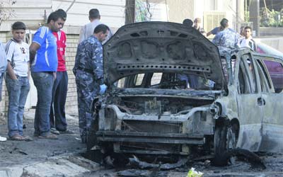 عناصر أمن يعاينون آثار انفجار قنبلة استهدفت سيارة في بغداد. أ.ب