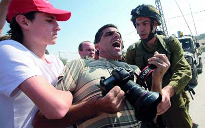 جندي إسرائيلي يقتاد مصوراً خلال المواجهات ضد الجدار بالقرب من بيت لحم. إي.بي.إيه