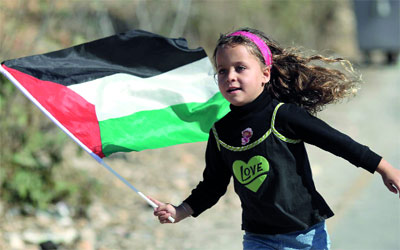 طفلة فلسطينية ترفع العلم خلال مواجهات الاحتلال في قرية النبي صالح بالضفة الغربية. إي.بي.إيه