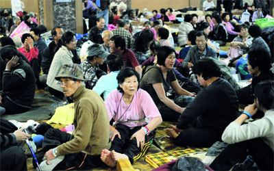 عدد من سكان يونبيونغ يجلسون في ملجأ مؤقت عقب إجلائهم عن الجزيرة. أ.ف.ب