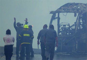 مسعفون إسرائيليون أمام الحافلة المحترقة. أ.ف.ب