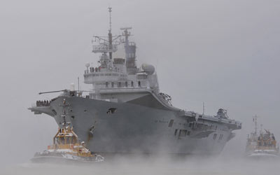 حاملة الطائرات عادت إلى ميناء بورتسموث أمس بعد أن أنهت آخر مهامها العسكرية. أ ب
