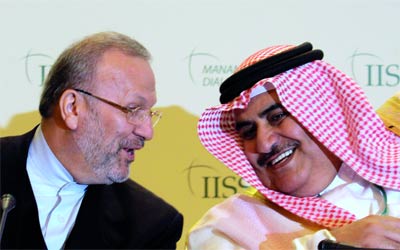 وزير الخارجية الإيراني متقي مع نظيره البحريني خلال منتدى المنامة. أ.ب