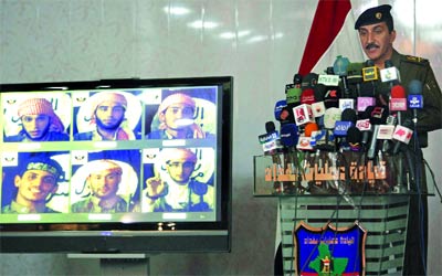 المتحدث باسم عمليات بغداد يعرض صور انتحاريين نفذوا عمليات في العراق. أ.ب