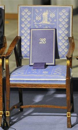 شهادة جائزة نوبل الخاصة بالمعارض الصيني موضوعة على معقد خال مثله أثناء الحفل اليوم - رويترز