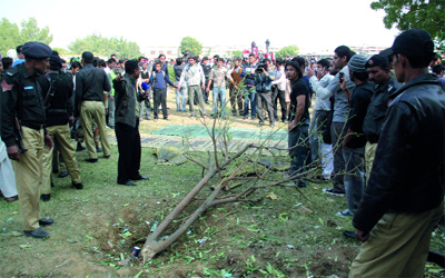 عناصر أمن يعاينون مكان الانفجار في جامعة كراتشي. إي.بي.إيه