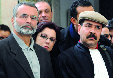 المحامي التونسي عبدالرؤوف عايدة (يسار) وشكري بلود خلال مؤتمر صحافي في تونس. أ.ب