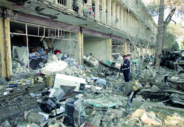 شرطي عراقي يقف بين الأنقاض أمام مبنى مديرية شرطة حماية المنشآت في بعقوبة. ا.ب