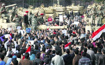 في أول نشاط رسمي معلن منذ بدء الاحتجاجات، زار الرئيس المصري حسني مبارك، أمس، مركز عمليات القوات المسلحة، حيث التقى كبار القادة، فيما توافد الآلاف من المتظاهرين إلى ميدان التحرير وسط القاهرة، مطالبين بتنحّي مبارك، ورافضين تولي اللواء عمر سليمان منصب نائب الرئيس والفريق أحمد شفيق رئيساً للحكومة، وفوضت المعارضة محمد البرادعي التفاوض مع النظام وسط تضارب أنباء، فيما اعتبرت وزيرة الخارجية الاميركية هيلاري كلينتون أن الرئيس المصري لم يقم بخطوات كافية، وابدت تأييدها «لانتقال منظم» الى الديمقراطية. وتزامن ذلك مع فرار آلاف السجناء، بينهم العديد من قيادات جماعة الاخوان المسلمون، وواصل الجيش نشر قواته بكثافة، خصوصاً في القاهرة لضبط الأمن بعد انتشار عمليات السلب والنهب.