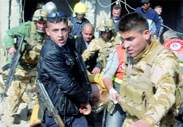 عناصر أمن يخرجون ضحية من منزل استهدف بتفجيرات كركوك. أ.ف.ب