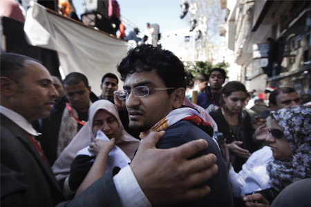 حراس القرضاوي يمنعون وائل غنيم من اعتلاء المنصة في ميدان التحرير