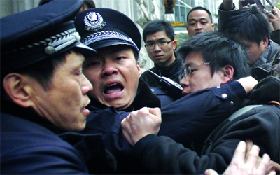 رجال شرطة يقبضون على ناشط إنترنت في شنغهاي. رويترز