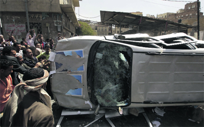 محتجون يحطمون سيارة حكومية أمام جامعة صنعاء حيث دارت الاشتباكات. رويترز