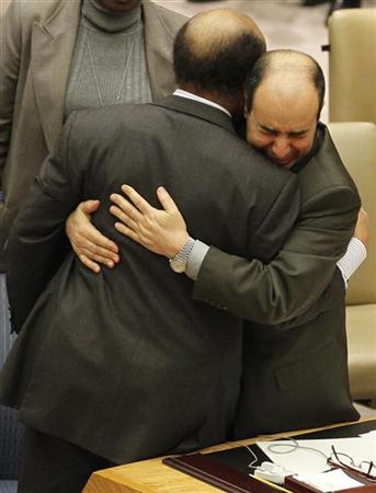 عبد الرحمن شلقم سفير ليبيا لدى الأمم المتحدة يعانق نائبه ابراهيم دباشي في مجلس الأمن الدولي-رويترز