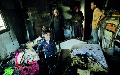 فلسطينيون في منزلهم الذي أحرقه مستوطنون في قرية حوارة. أ.ب
