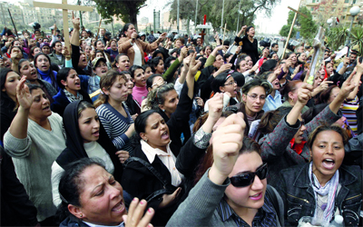قبطيات يتظاهرن أمام مبنى ماسبيرو احتجاجاً على هدم كنيسة أطفيح. رويترز
